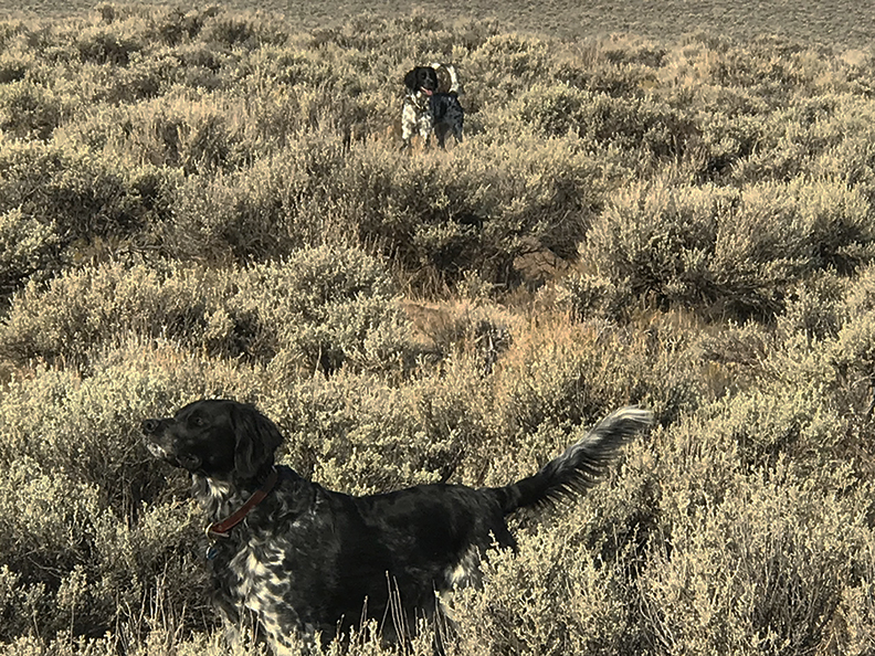 John called it the picture of a lifetime, and that it is! The Rocky Mountains in the background are stunning. The detailed fence divides pasture in this northern Utah intermountain valley. And the dogs, they look like Pheasant Philosophers, calmly contemplating just where the next rooster might be hiding.