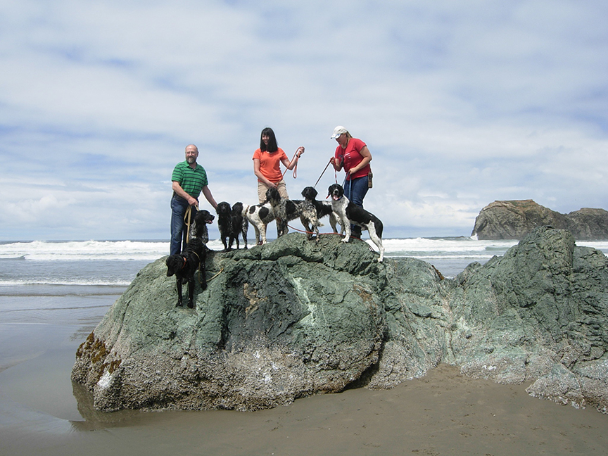 All these dogs are members of families where hunting is a big part of life. Given this level of wear and tear, Pika and Picard had their cruciate ligament repaired late in life and this has given them more hunting years. In a survey about dog lifespan and health conducted by Wild und Hand Magazine in Germany, 164 hunters reported on versatile dogs (53%) plus dogs of 6 other breeds. The oldest dog was 17 years old. By far the most common cause of death was cancer. The most common illnesses were bone related. Professionals and experienced dog people give several pieces of advice. These include feeding high quality food, keeping a dog in sound physical condition year-round, and using a warm-up and cool-down period after intense physical activity. Our dogs work like athletes, they deserve the same care athletes give themselves. How many Feature Dogs can one fit on 1 rock?(June-Oct., 2014)