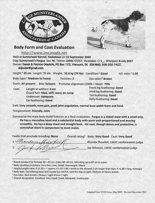 Sunnynnook's Fergus recently added Conformation to his previously established qualifications in Field and Health earning him an approval for breeding by the Registrar of the Large Munsterlander Association of Canada (LMAC). Fergus lives with Derek, Patricia and Dawson Oderkirk in Viscount, Saskatchewan. Derek is a new member of the LMAC Board of Directors. |