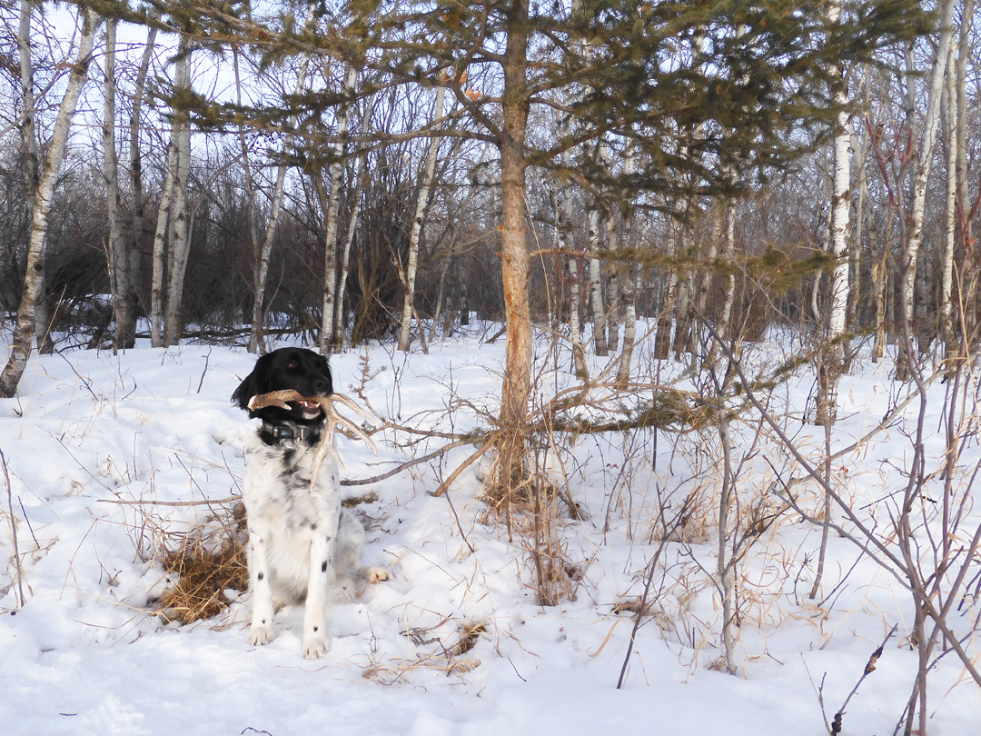While I was busy filling the bird feeder, Sunnynook's Gannet had found this White-tailed Deer antler in the woods around the house and proudly delivered it. In the versatile hunting dog tradition, there has been a long-standing test, called "Bringtreue" in Germany and Austria, translating to committed or faithful retrieving. The key is that a dog finds game, and of its own volition, out of sight and without being commanded to do so, picks it up and brings it to the owner.