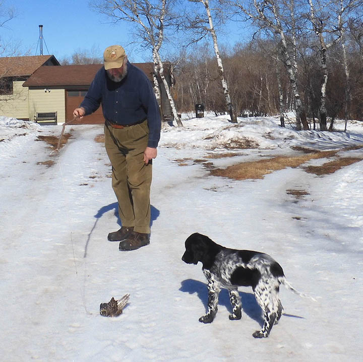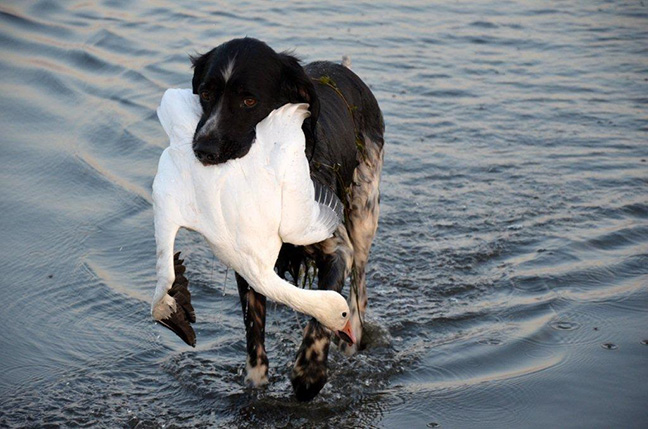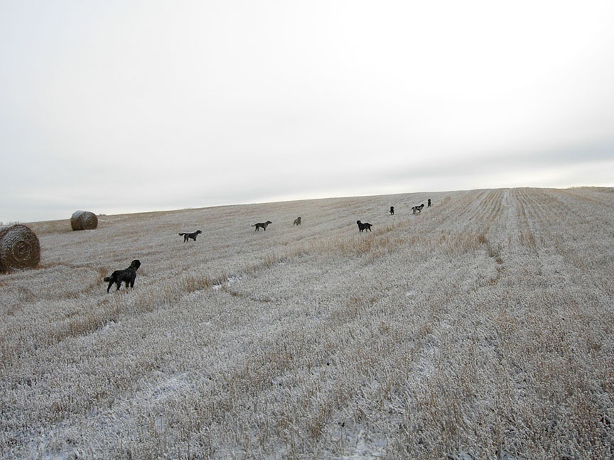 Retrieving commitment refers to a dog's willingness to pick up and carry a game animal that may lie outside its comfort zone. Not every dog will pick up a merganser (fish duck) or even a woodcock. When retrieving commitment is tested in Germany, a dog is expected to find and retrieve a dead fox. Such a dog shows commitment, it is trustworthy. It displays Bringtreue or Btr. I have personally been forced to leave a crane to its hapless fate after other hunters had winged it. When I encouraged my dogs to chase and retrieve it, we failed in retrieving commitment. Three of my dogs pursued it across the marsh but eventually backed away when the crane stood its ground. When a wounded animal resists, as in the case of the Sandhill Crane, or when cold water or thorns cause temporary discomfort, retrieving-gumption is called for. This gumption is described as Härte in German. The crane was not only unusual quarry outside the dogs' comfort zone, it also put up a fight.