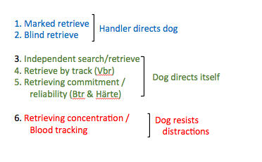 The chart shows six components of retrieving that overlap but are also different: The marked retrieve works best if a dog can remember not only direction but also the distance of the fall. For escape-artist species like pheasants, a good mark and quickly getting to the spot, can make or break the day. The blind retrieve is the forté of retrievers and spectacular to watch. It requires a dog to 'take lines' and to strictly obey the voice and hand signals of the hunter. It works well if the hunter knows the hidden location of a bird no longer moving. A friend once entered his German Short-haired Pointer in a retriever competition out of pure interest. The GSP did a good job on blind retrieves but the owner felt that the difference between diligent adherence to lines and commands vs. independent work is so deeply rooted in a dog that it should not to be trivialized. It goes to "what a dog is" and not simply to "what a dog does". My friend felt his well-bred shorthair needed more training to be successful than should be required of most well-bred retrievers. It's an open question as to whether a dog exposed to both, contradictory methods is less effective in both. |